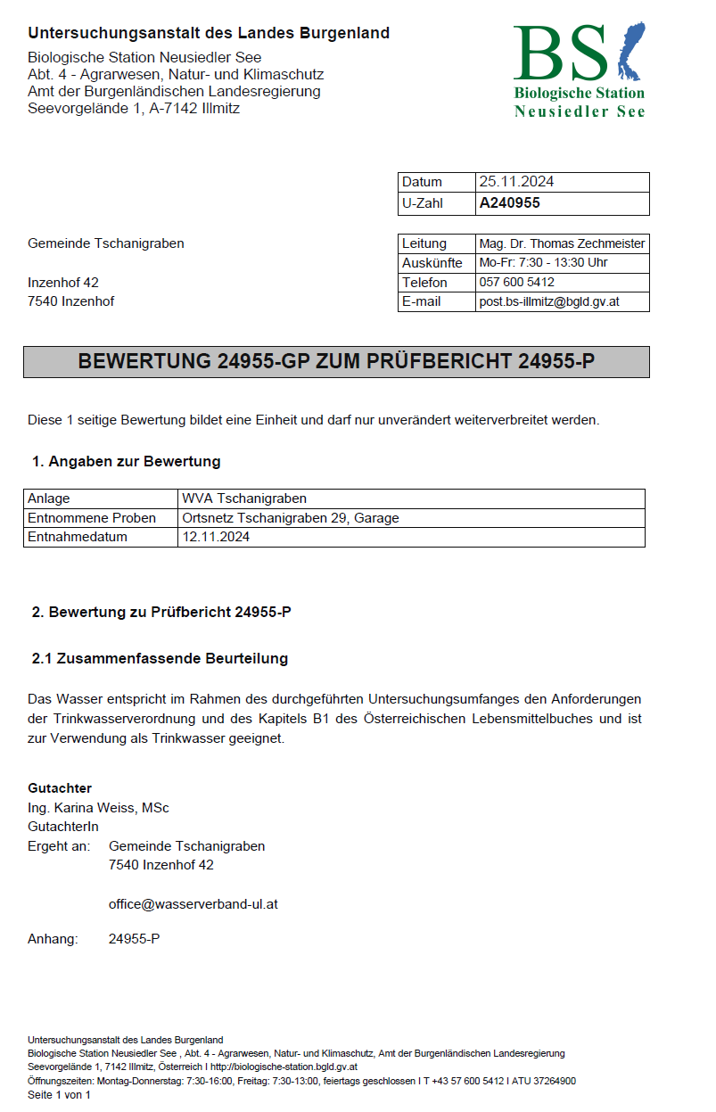 Wasseruntersuchung Ortsnetz Tschanigraben